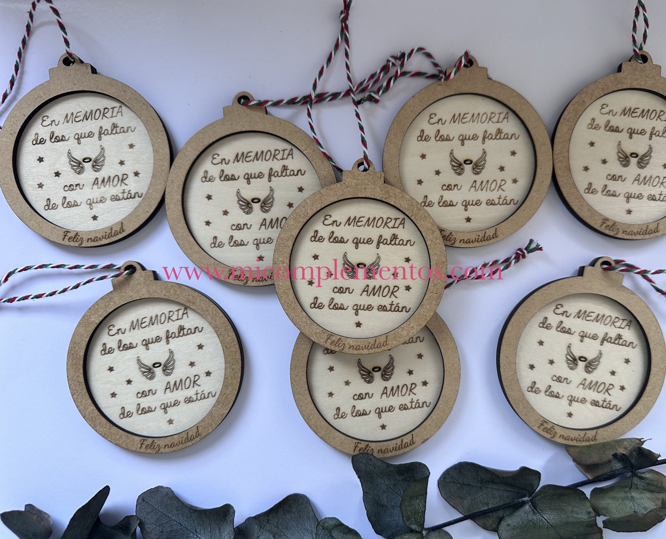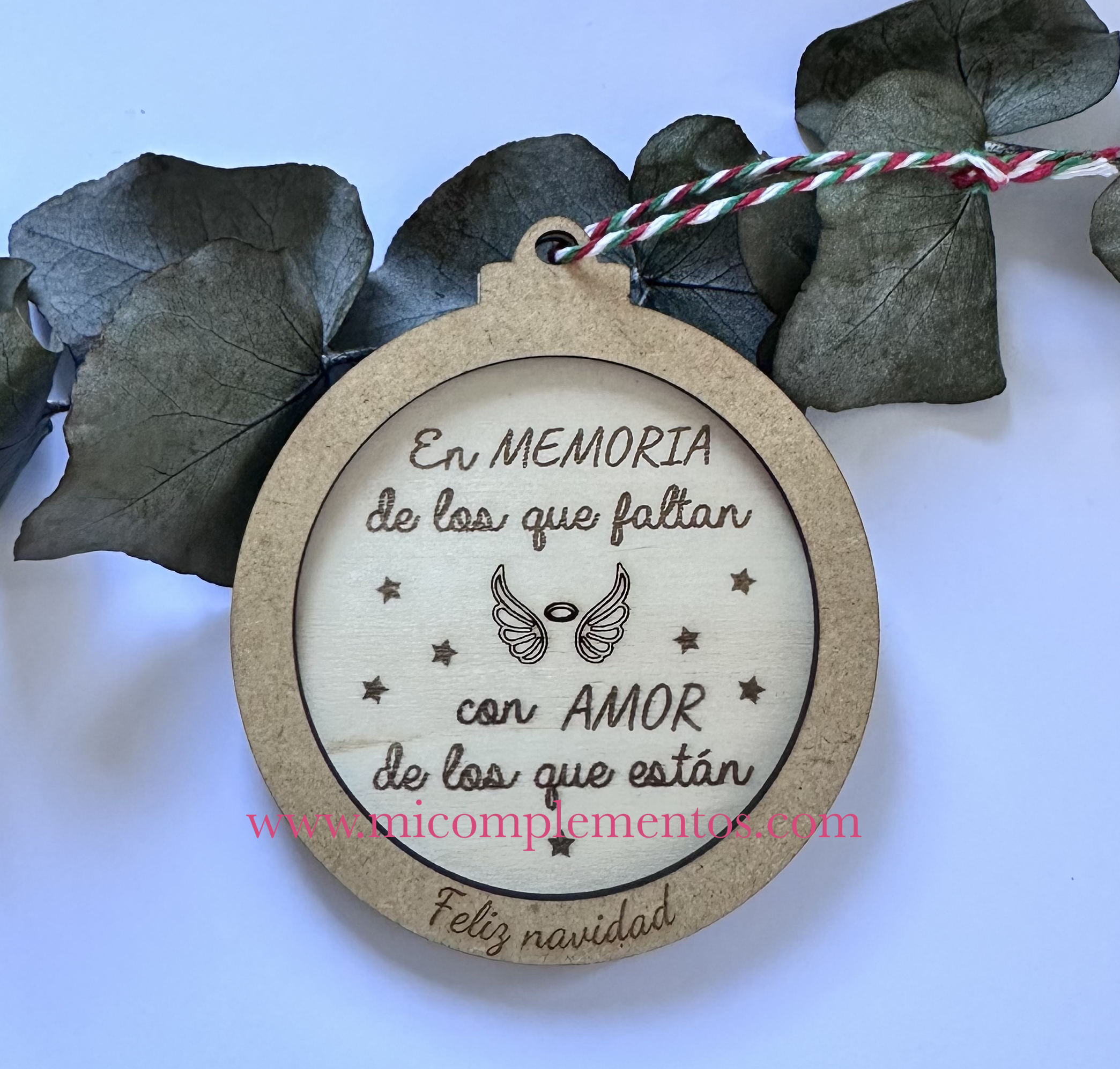 Adorno navideño fabricado en madera de dos tonos con la frase en memoria de los que faltan con amor de los que están.