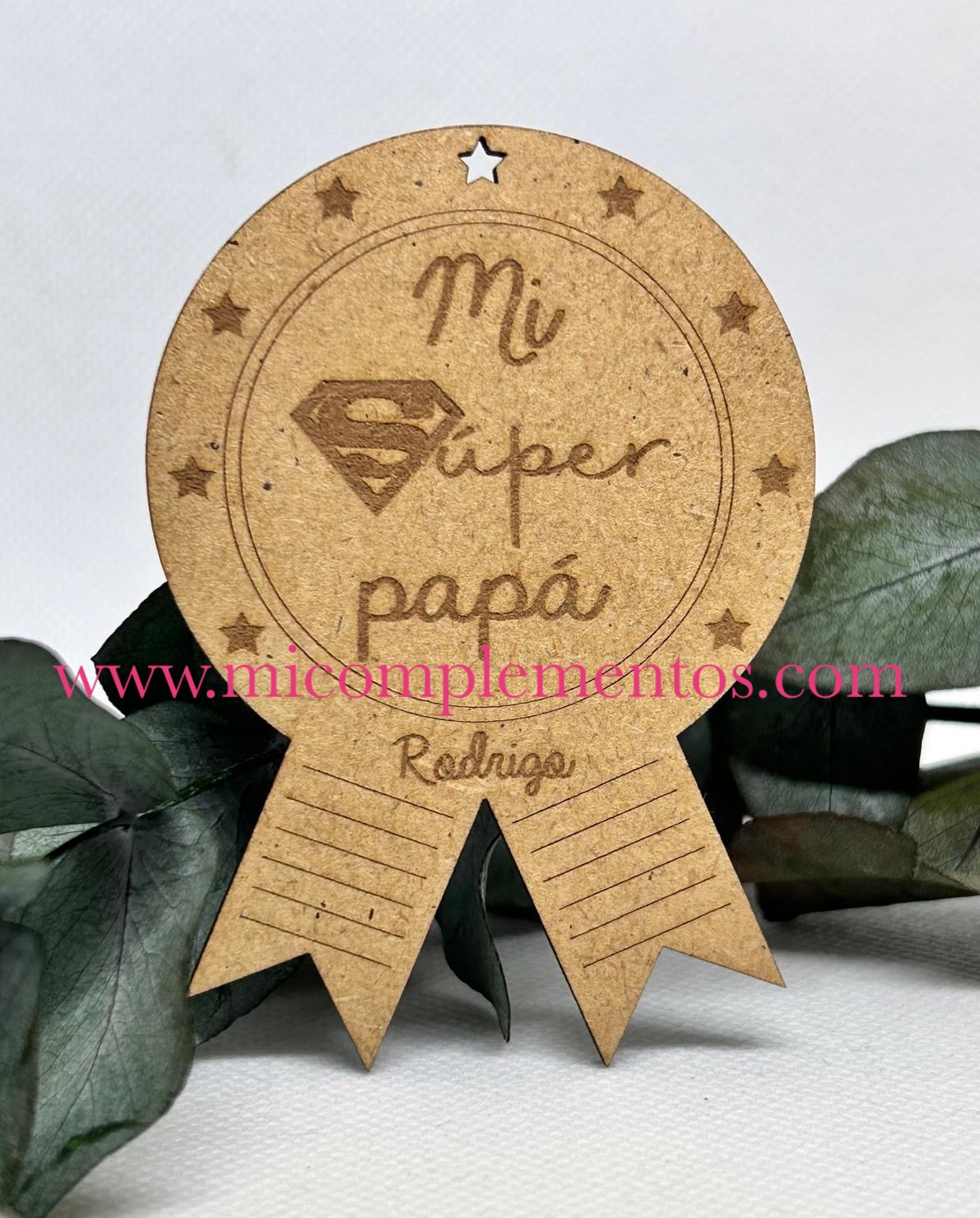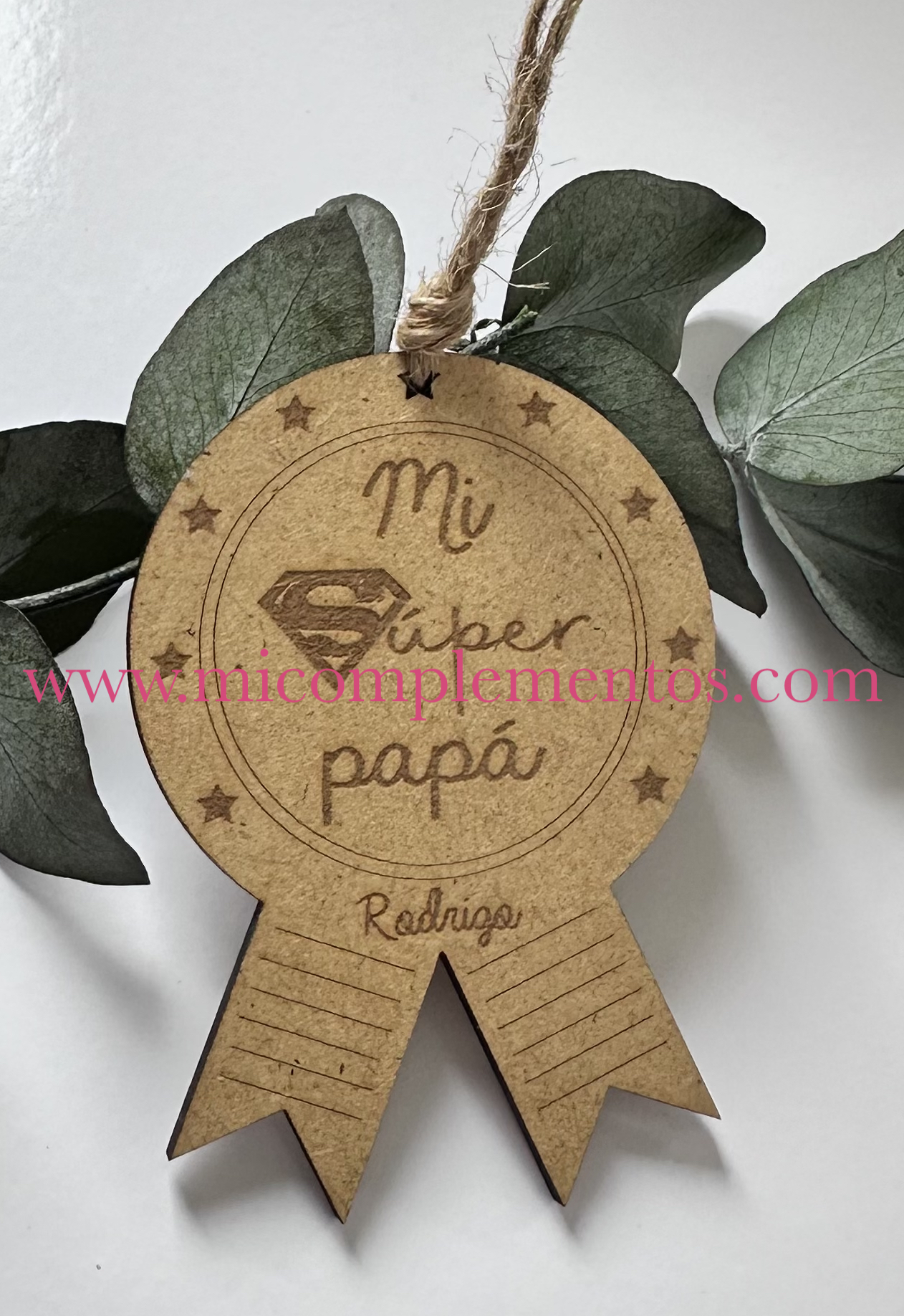 Nuestra insignia de madera personalizada con la frase mi/nuestro súper papá es un detalle perfecto y muy versátil. Puedes elegirlo con imán detrás, como chapa o con cuerda como colgador de coche adaptándose a los gustos y funciones de todos los papás.