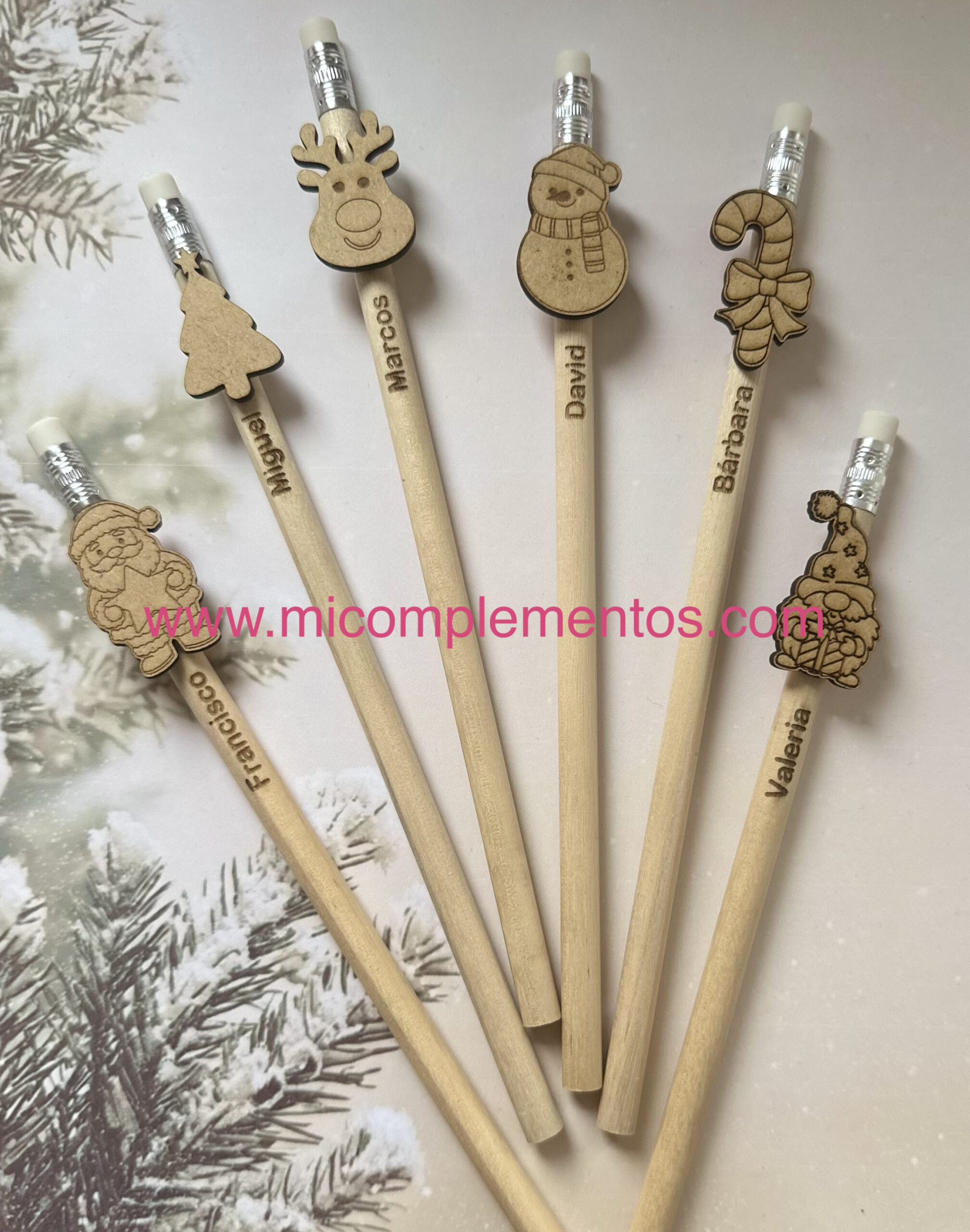 Lápiz de madera personalizado con nombre grabado y dibujo de navidad en relieve.