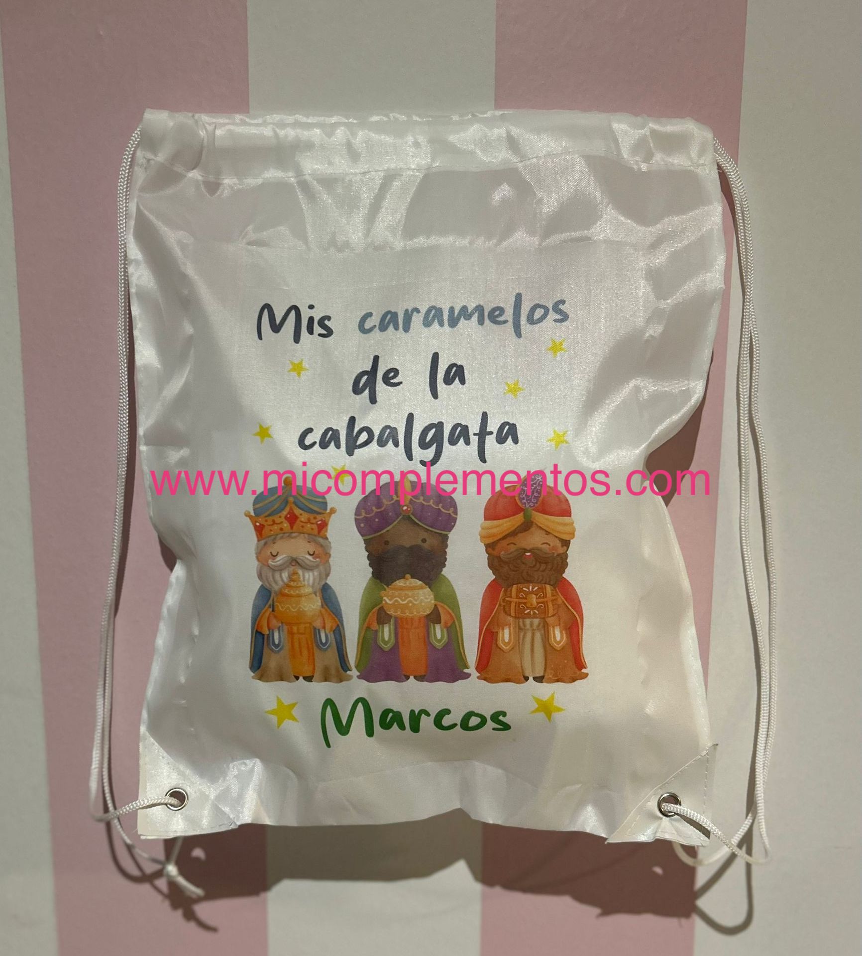 Mochila con cuerdas autocierre en color blanco personalizada para los caramelos de la cabalgata de reyes.