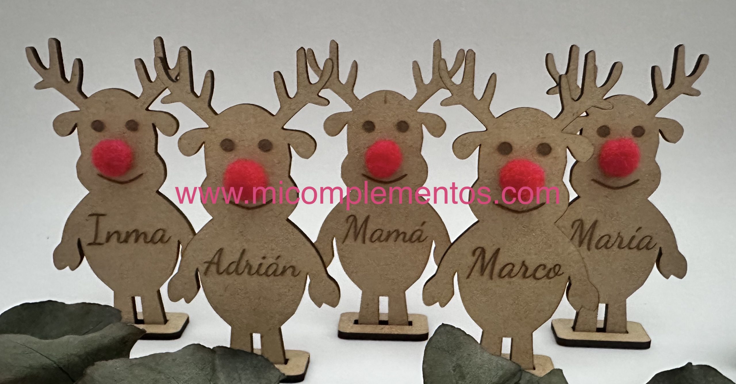 Estos simpáticos renos fabricados en madera personalizados con el nombre grabado son el detalle perfecto para adornar la mesa de navidad usándolo a modo de marcasitios.